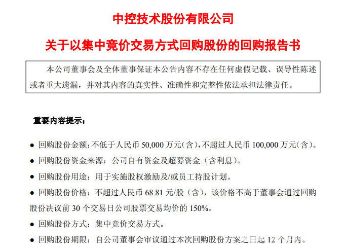 10月24日,中控技术(688777)公告称,公司拟使用自有资金及超募资金以集中竞价的方式向社会公众股东回购公司股份。本次回购股份的资金总额不低于5亿元且不超过10亿元,价格不超过人民币68.81元/股(含)。本次回购股份将用于实施股权激励及/或员工持股计划。